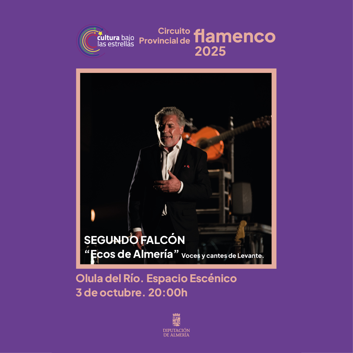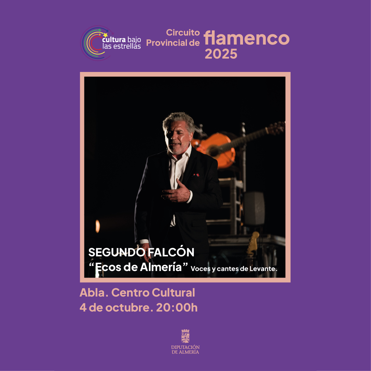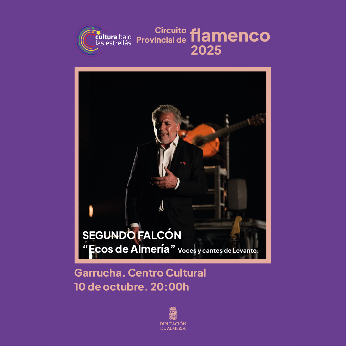 Espectáculo: “Ecos de Almería”. Voces y cantes de Levante. Este proyecto rinde homenaje a los grandes cantaores de Almería, a figuras legendarias como El Ciego de la Playa o Pedro el Morato, y a los cantes de levante. El espectáculo explora los cantes mineros, la malagueña de Chacón, la soleá y los tarantos en un recorrido sonoro y visual por el alma del flamenco almeriense. La guitarra flamenca de David de La Fragua, fiel a las tonalidades y afinaciones tradicionales, acompaña a los cantes interpretados por Segundo Falcón. “Ecos de Almería” rescata el legado de estos grandes maestros y reivindica la singularidad e importancia de Almería en el desarrollo del flamenco andaluz.